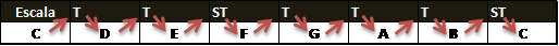 Vou colocar agora o padrão das escalas maiores completo: T, T, ST, T, T, T, ST. Usaremos a escala de C como exemplo.