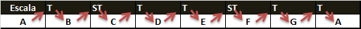 Fórmula: T, ST, T, T, ST, T, T. Usaremos a escala de Am como exemplo. Olhe a tabela abaixo:
